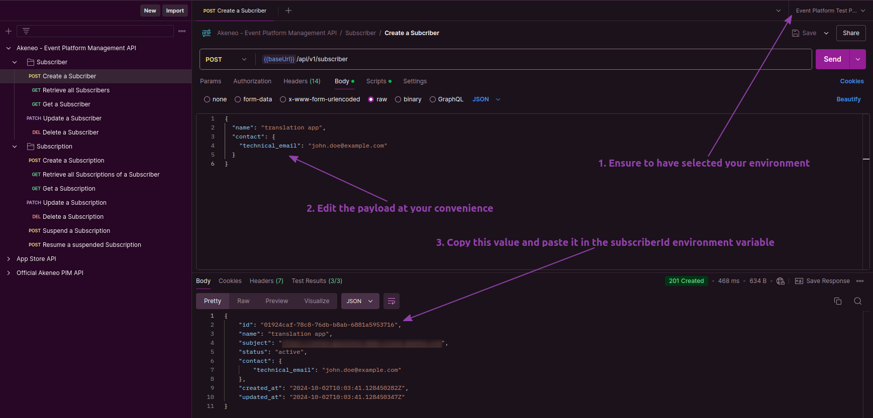You can create a subscriber once you have a valid PIM API token. A subscriber is an entity to which all of your subscriptions will be attached.